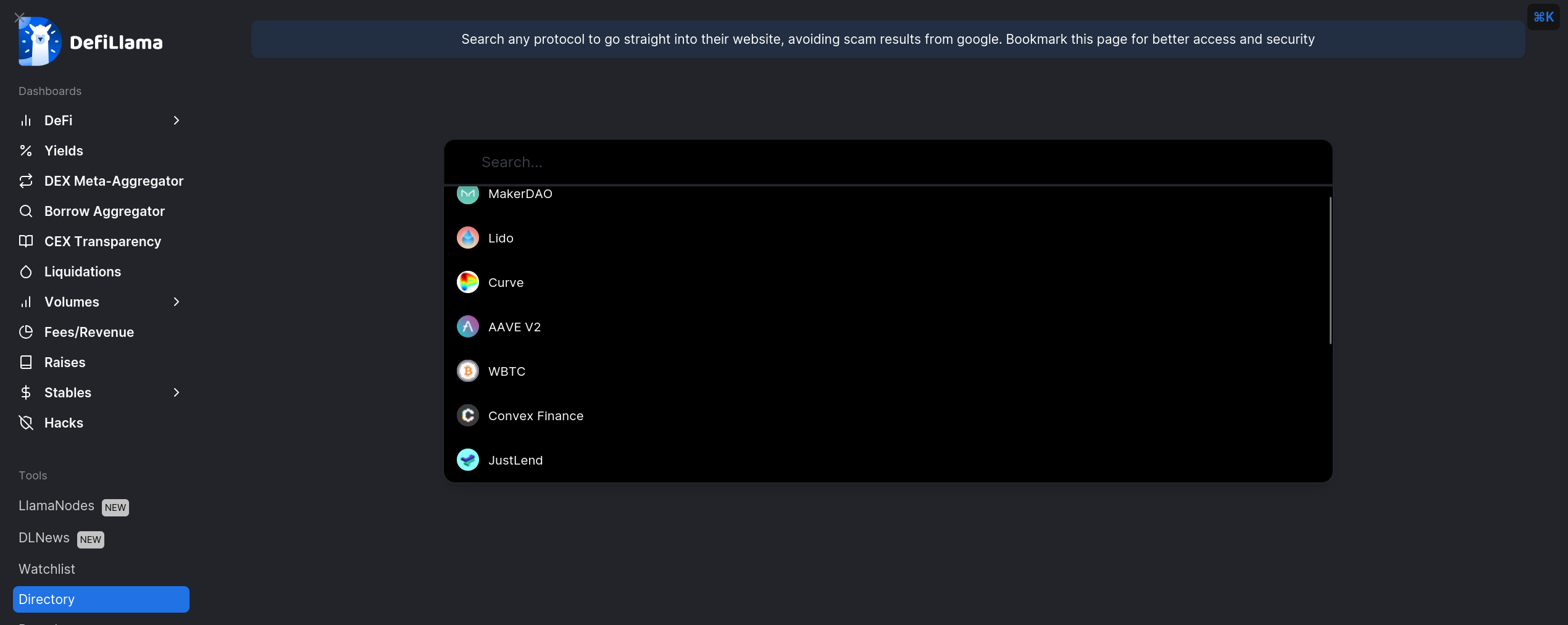 Use DefiLlama's link directory tool in order to find an application's official link when you need it. DefiLlama operates a great analytic dashboard with plenty of information regarding defi protocols and in 2022 they added an amazing link directory tool through which they provide legitimate, safe links to defi applications.