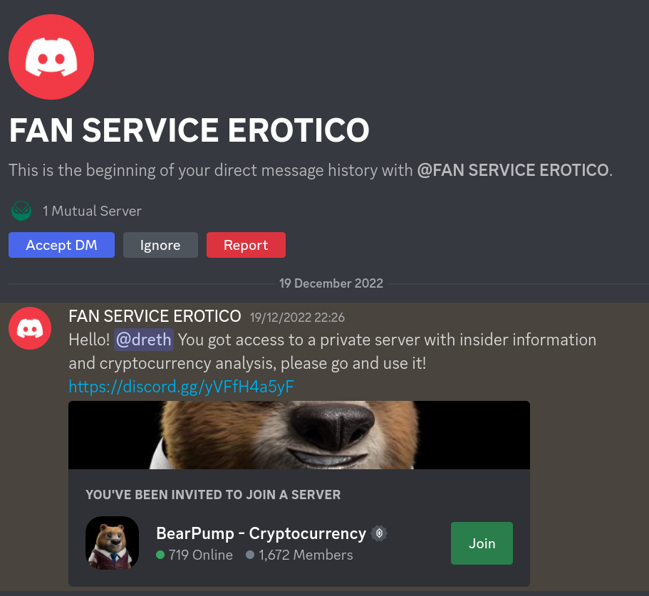 Scam: The server may contain links to websites that suggest making malicious transactions, phishing sites among other types of harmful content. The server may recommend and instruct purchasing a token to 'pump and dump it' so that the 'exclusive server members' can take part in it, but the server members are the ones that will be tricked and get 'dumped on' meaning that they would purchase the token as instructed, but the server owners will sell it right after the member buys it in order to profit from their purchase.