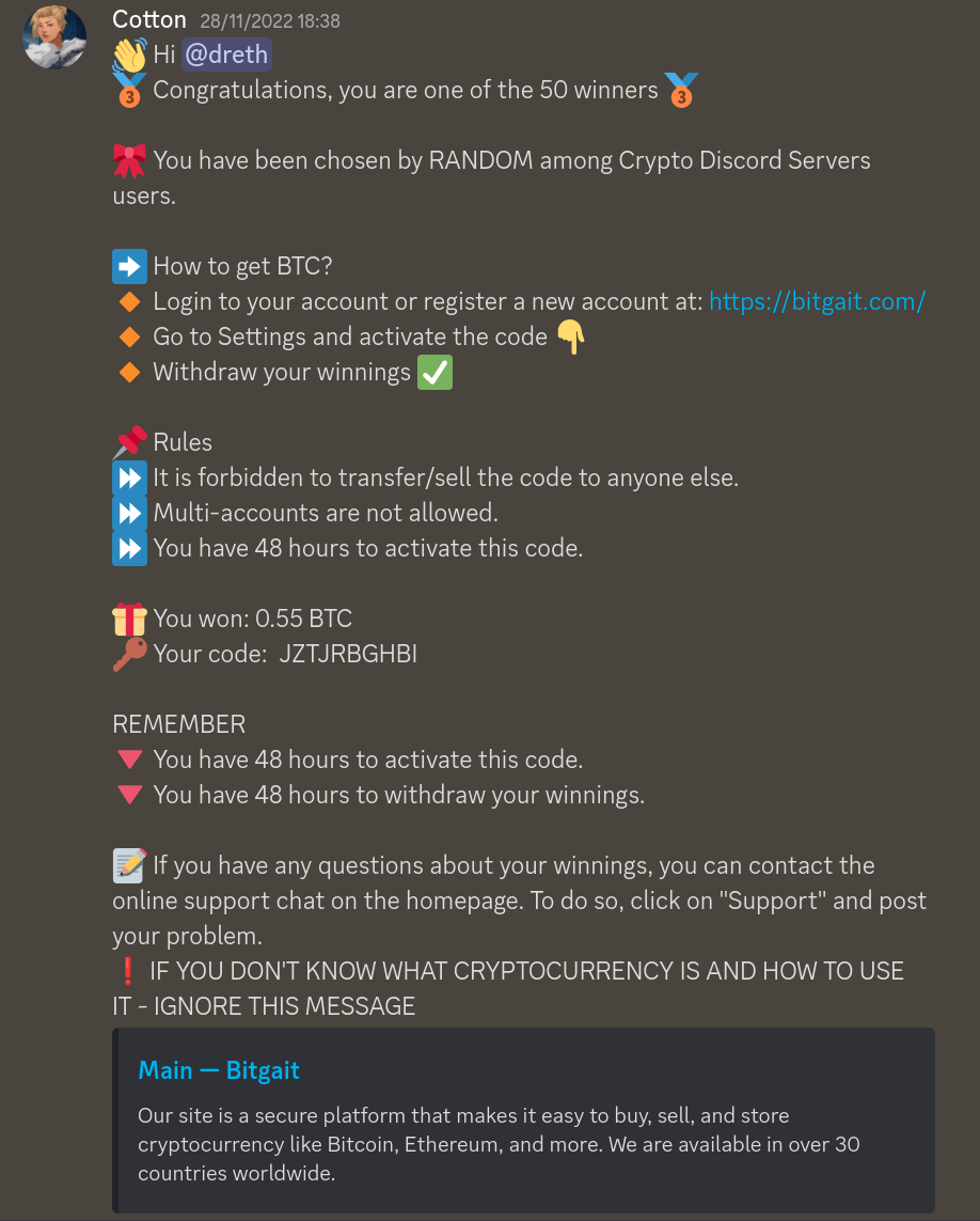 Message: Notification that you've won an airdrop, which is typically an event where past users of an application or other qualified people (usually contributors) are given an amount of crypto for free as a result of their participation or contributions to the community/project. These are never notified through a discord DM, and you would more or less know if you are going to receive it or not.
