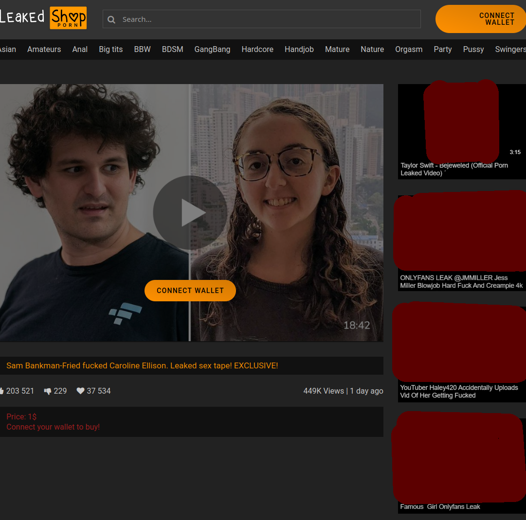 Message: A message telling me there's a way to look at a viral supposed sex tape of Caroline Ellison and Sam Bankman-Fried, two notorious criminals that orchestrated the Alameda + FTX fraud and former romantic partners. A large scale fraud that stole money from investors, clients, celebrities and could be the largest ever scam in the history of cryptocurrency. The sex tape is theorized to exist, but there's been zero confirmation of it and it has never actually surfaced.