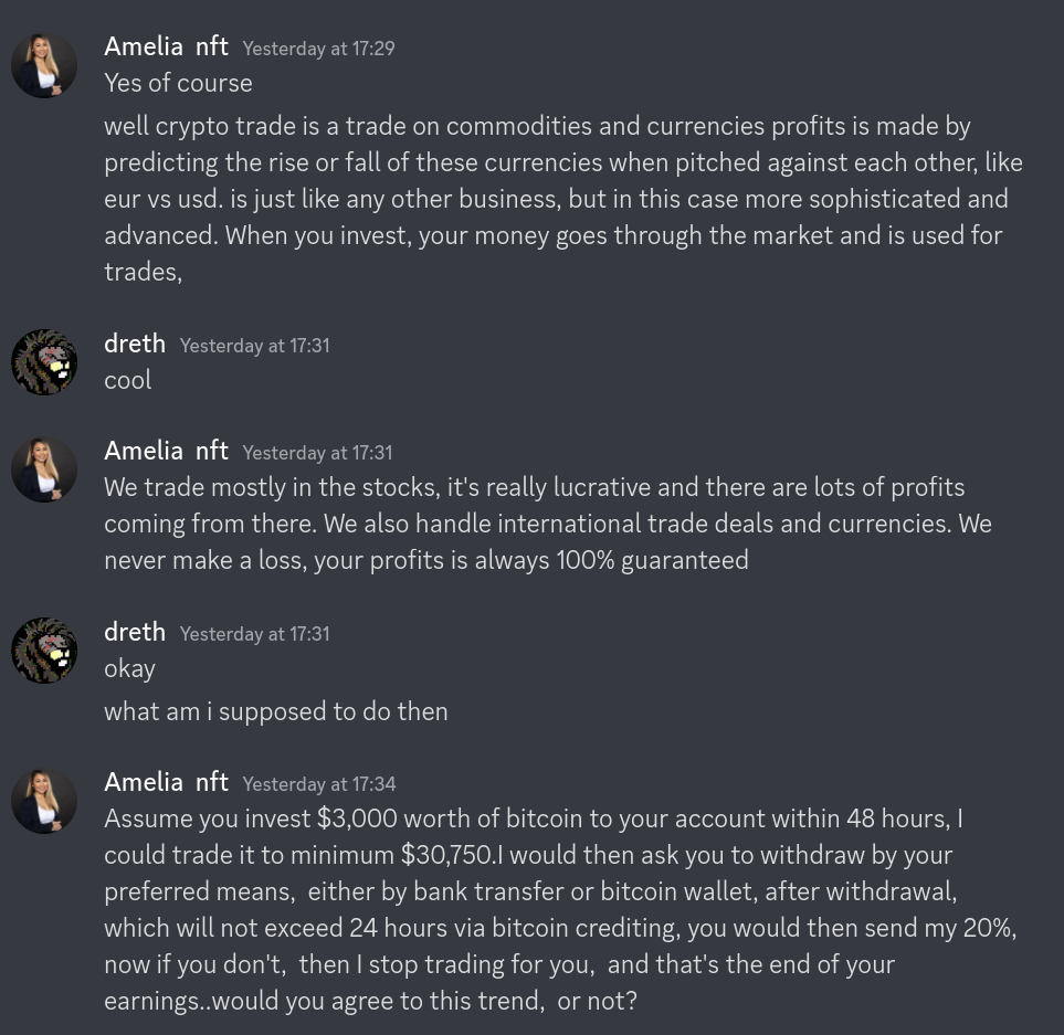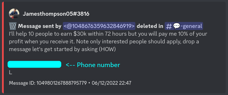 In either case, this is essentially just an offer to supposedly invest in some sort of high yield investment platform where they're going to multiply my money by basically taking it, blocking me, deleting the conversation for both of us and disappearing. One of the great perks of telegram is that you can delete conversations fully for both parties, something that scammers love to do either after a successful scam or a failed one. Here's their message: