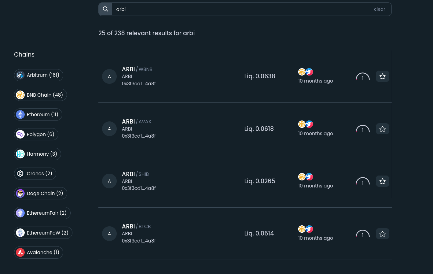 Sometimes scam tokens are used to create trading pairs of tokens that just haven't even been released yet. For example, at the time of writing this section (16th January, 2023), the Arbitrum optimistic rollup on Ethereum hasn't released an official token. Since Arbitrum doesn't have an official token but lots of people expect it to have one at some point, opportunistic scammers often create trading pairs with fake ARBI or ARBITRUM tokens in order to fool real traders into believing the token has already been deployed and to show that they're buying the real deal. People may want to buy these tokens because they might have a big run up from the moment of release, as there's lots of hype surrounding token deployments like this one. It's almost certain that every single trading pair created with the name ARBI or ARBITRUM at the moment is a scam pair: