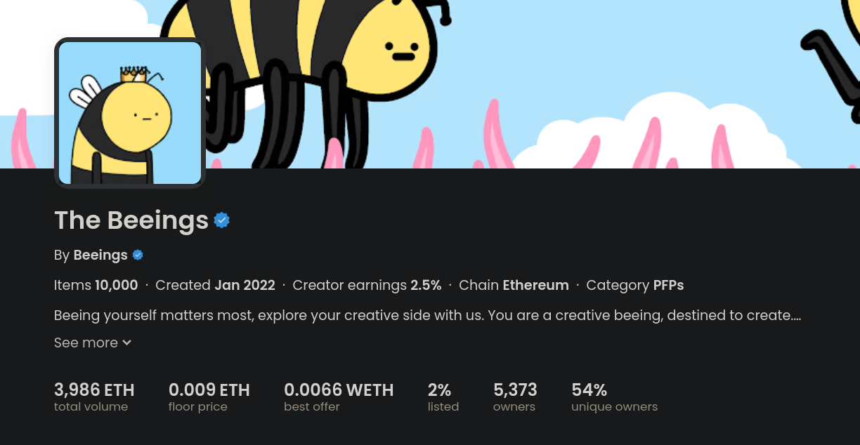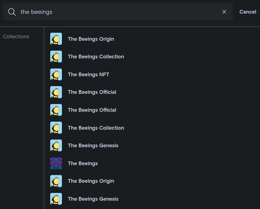 One such example of a collection with a ton of copies of it out there that scammers have made a concerted effort to target users with is The Beeings collection. Here we can see the official Beeings collection on Opensea: