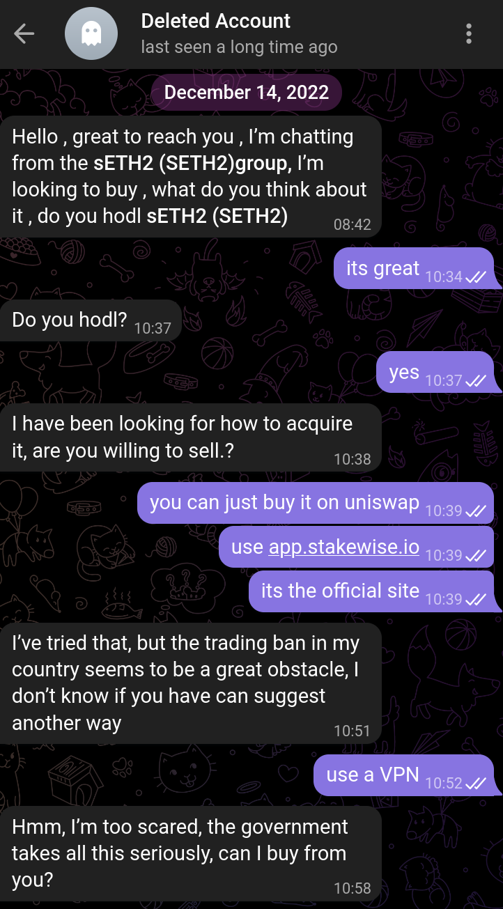 Message: a request to swap tokens peer 2 peer with someone that 'cannot acquire them through a decentralized exchange due to restrictions in their jurisdiction'.