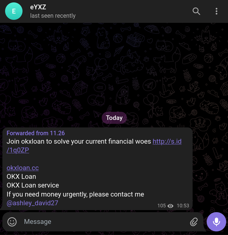 Message: a forwarded message recommending me to join a site called 'okxloan' (OKX is a well known large cryptocurrency exchange) to 'solve my financial woes'
