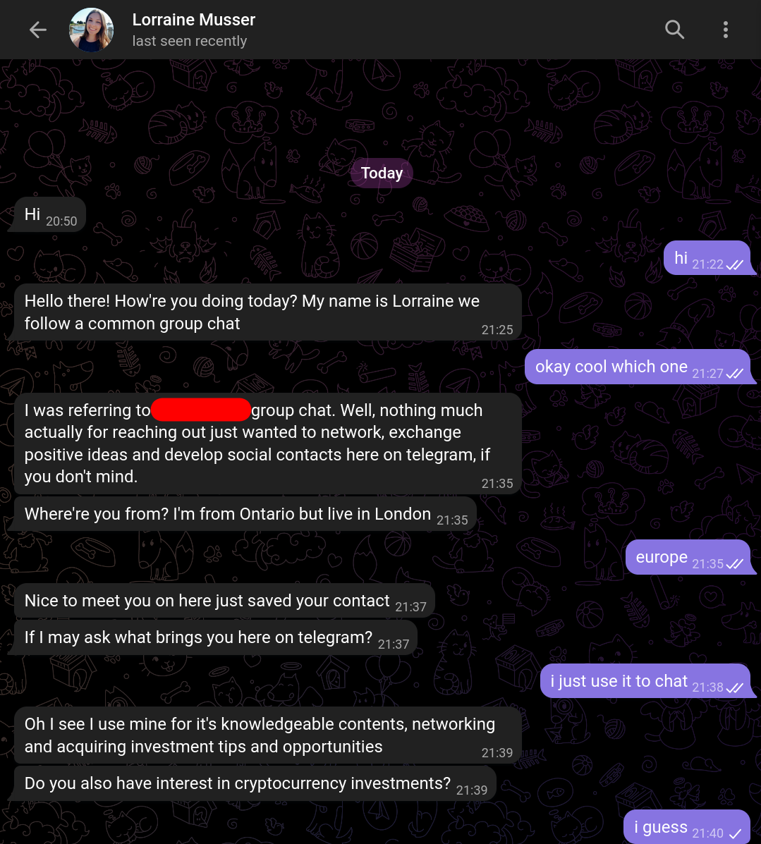 Message: just a greeting from someone that looks to be supposedly a young woman asking me about interests in cryptocurrency investments. Writing rather long messages despite my very short, clearly uninterested replies.