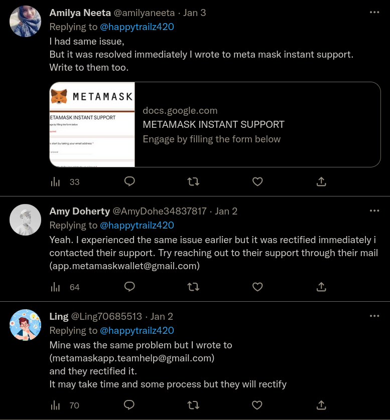 Twitter is rampant with scams. It is absolutely packed with fake pages, scam tweets, bots offering you help and support, etc. In fact, at times, just saying the word 'Metamask' or any other keyword like this will make it so that a massive flock of bots replies to your tweet with scam links and email addresses: